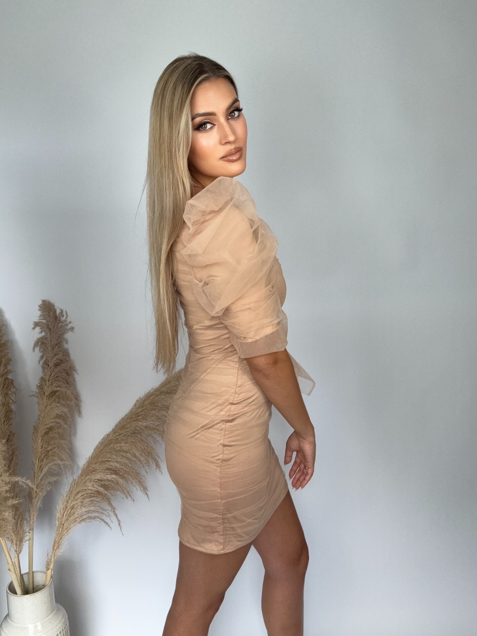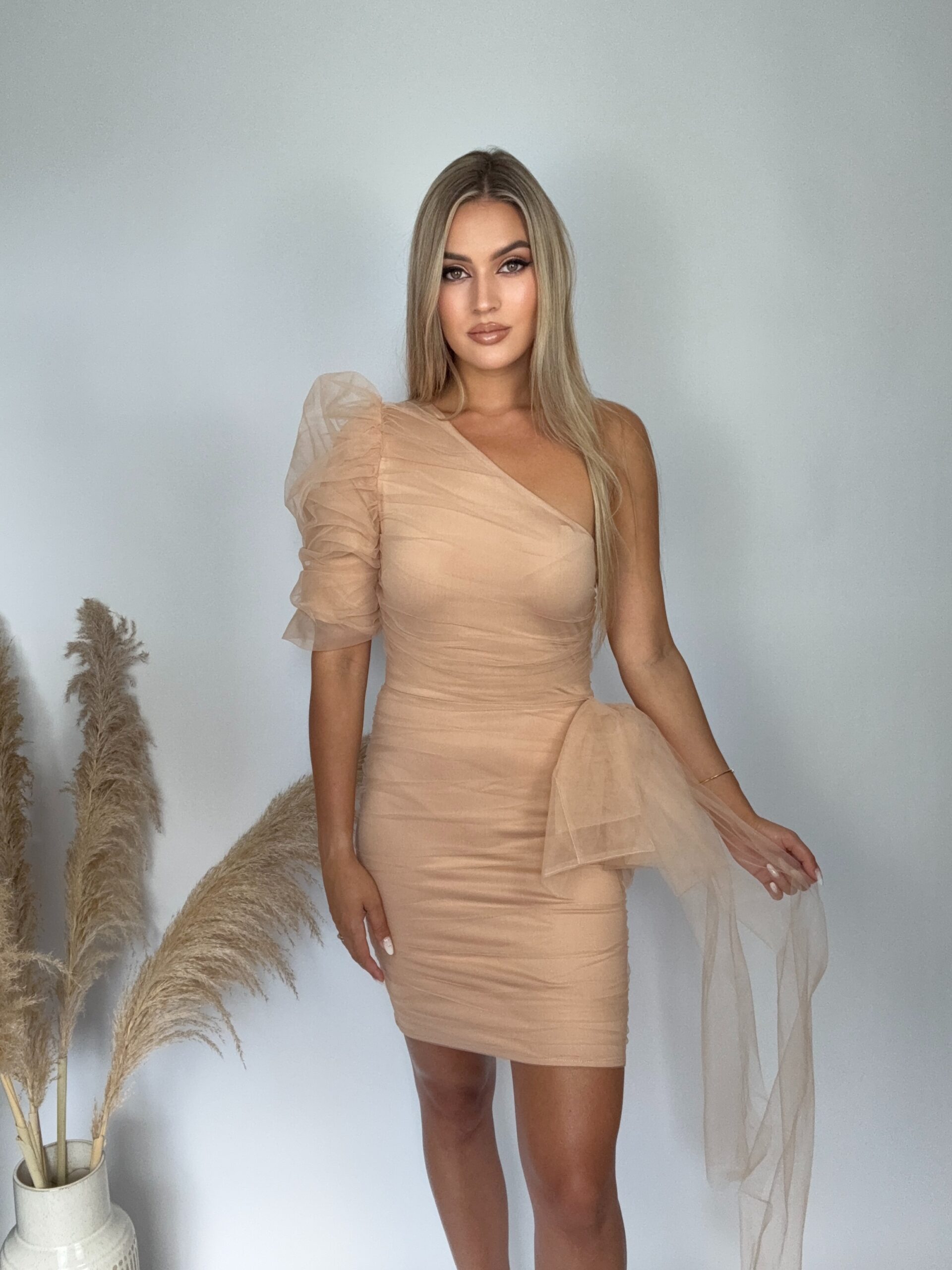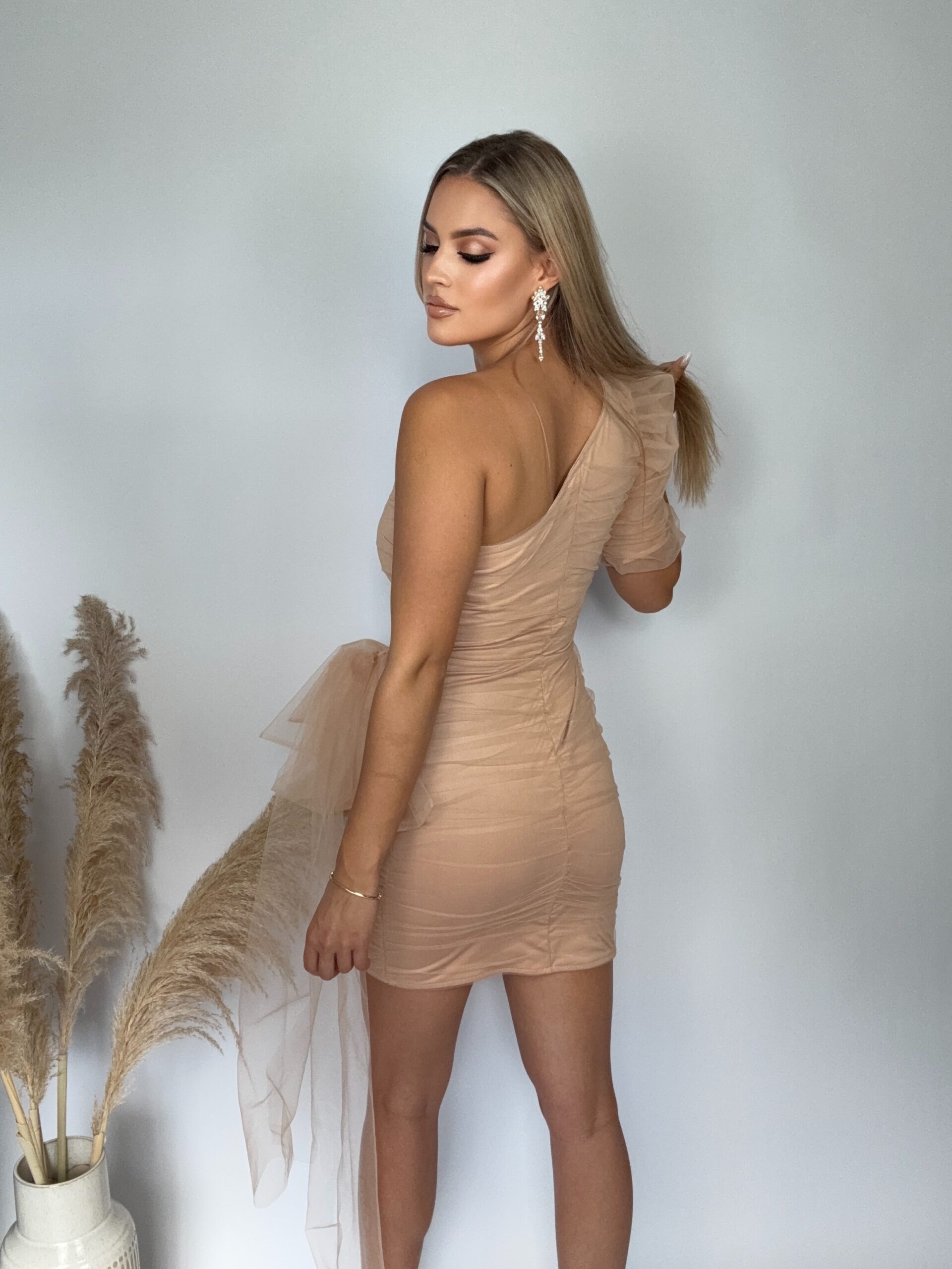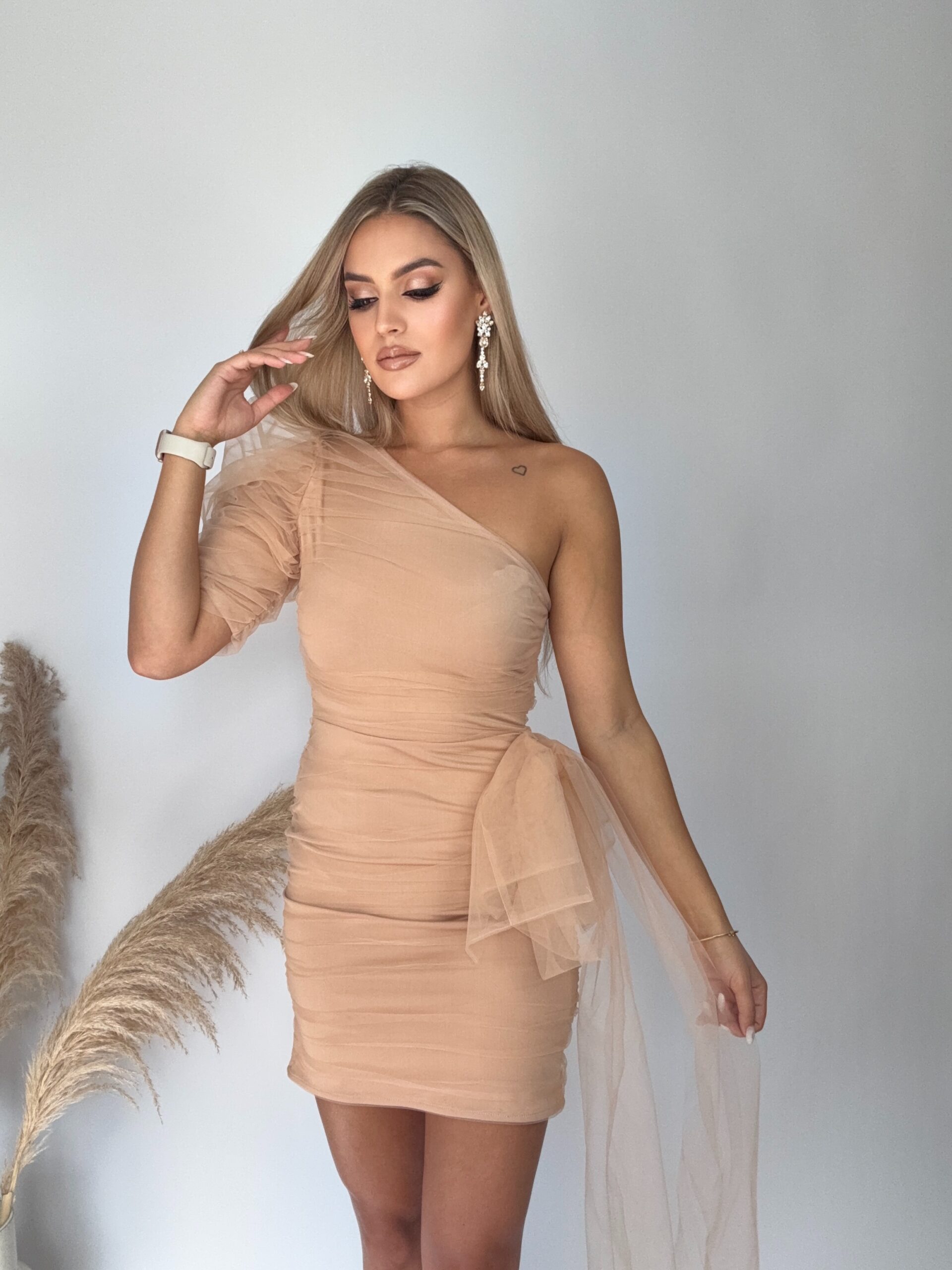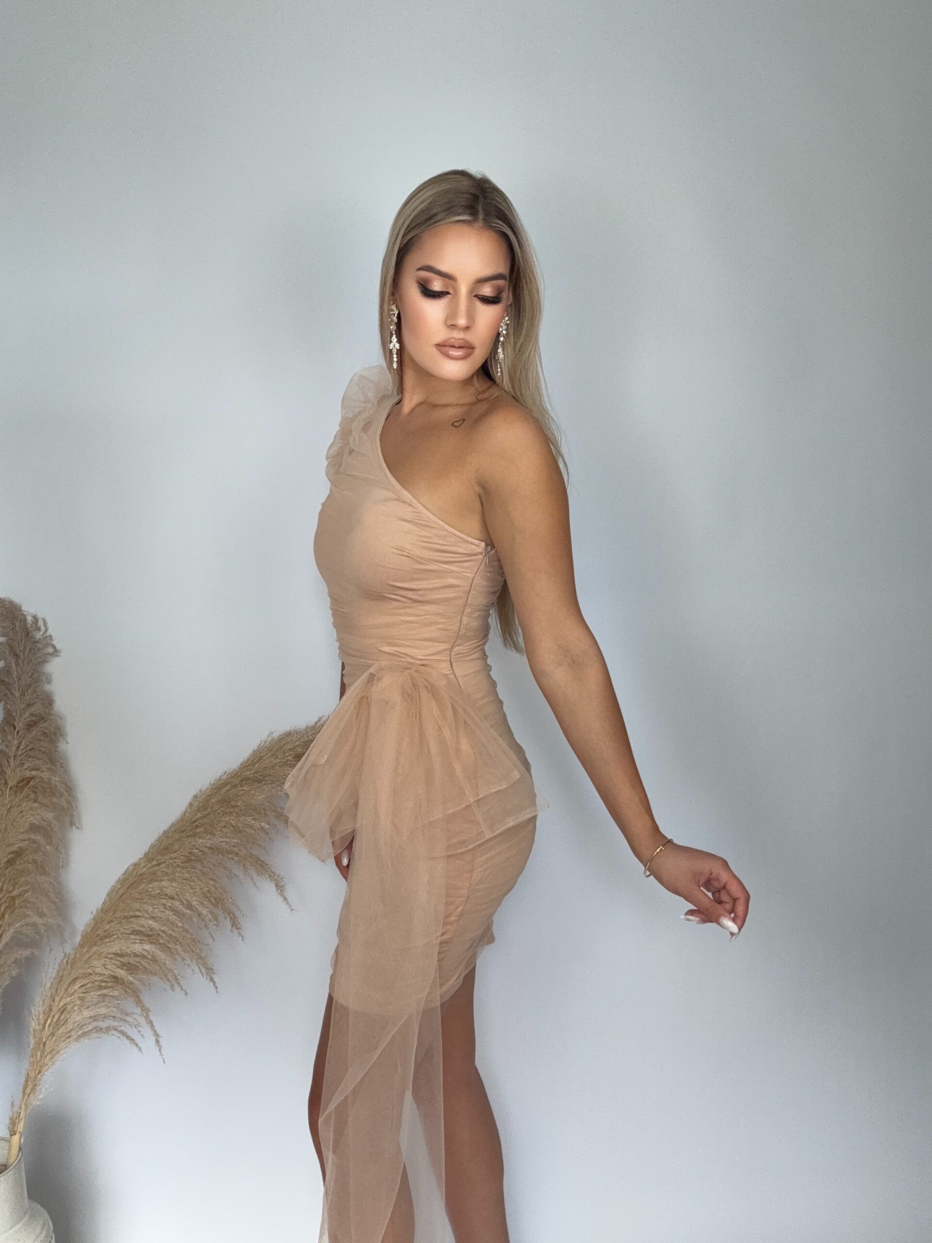 Kup terazCarmen – delikatna, tiulowa sukienka na jedno ramię z efektowną falbaną i kokardą, idealna na eleganckie przyjęcia.